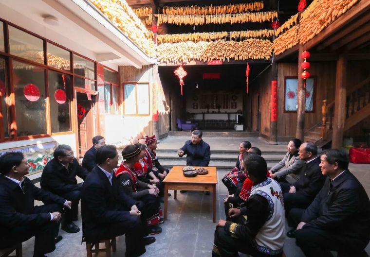 ↑2020年1月19日,習近平在云南騰沖市清水鄉三家村中寨司莫拉佤族村,同村民李發順一家聊家常,詳細詢問脫貧情況。