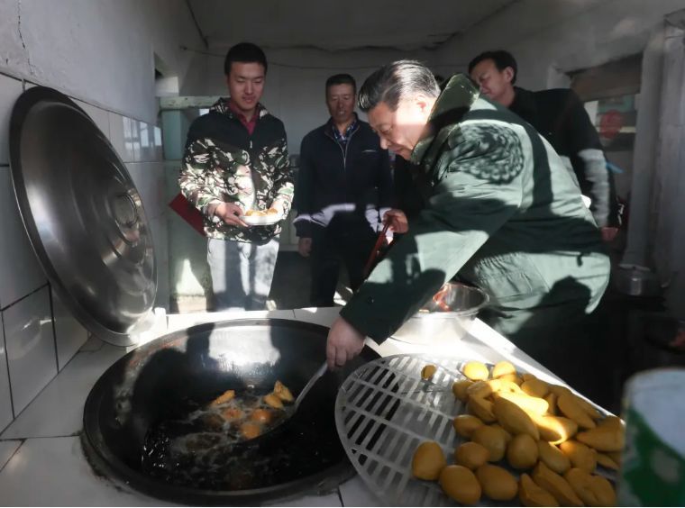 ↑2017年1月24日,習近平在河北張家口市張北縣小二臺鎮德勝村村民徐學海家炸年糕。