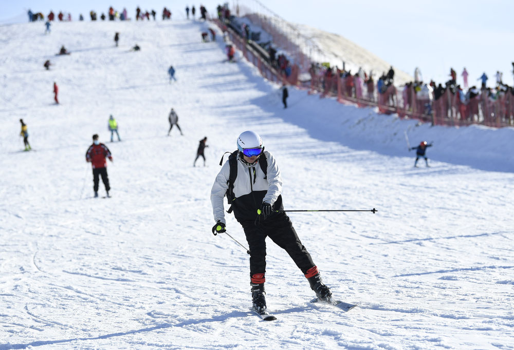 1月30日,市民在寧夏銀川市閱海滑雪場體驗滑雪運動。