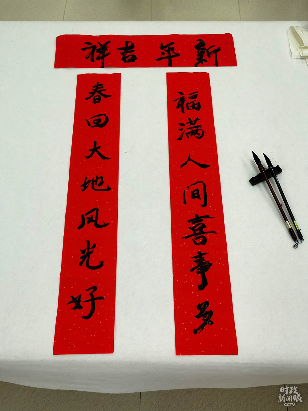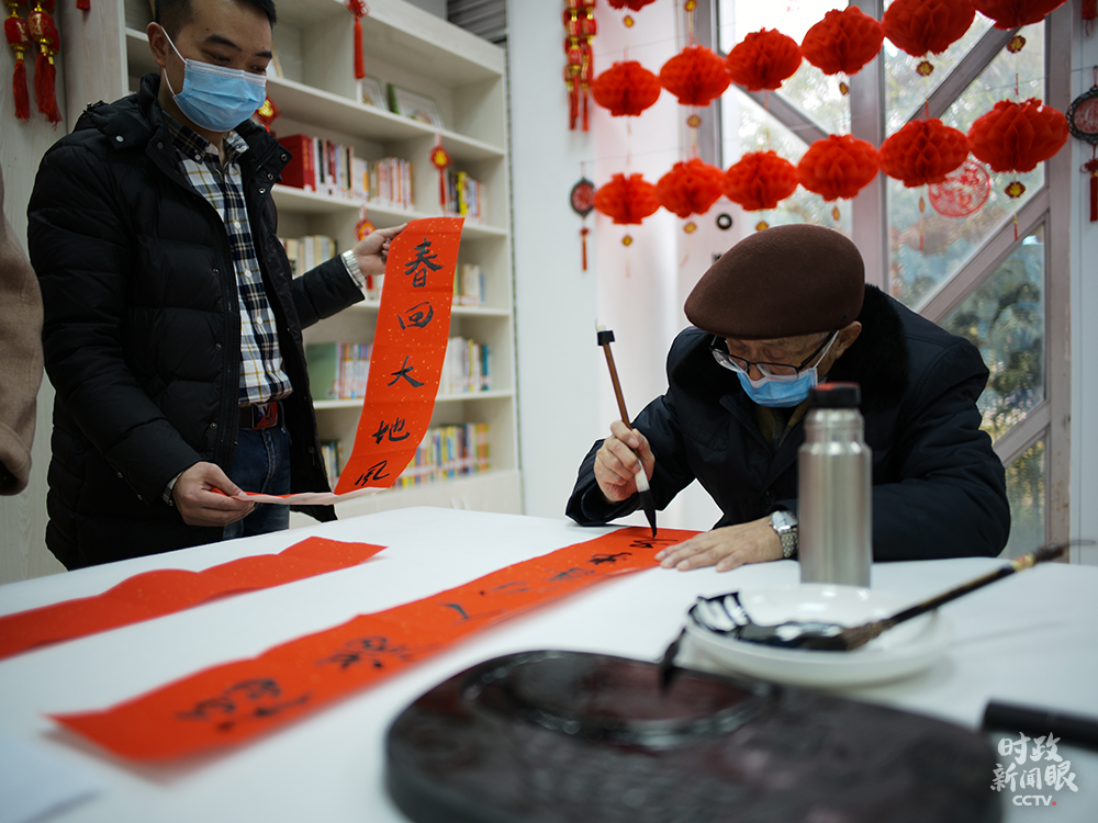 △84歲的社區(qū)居民戴世倫老先生,曾在貴州廣播電視大學任教。這是他寫的春聯(lián)。(總臺央視記者彭漢明、姚瑤拍攝)