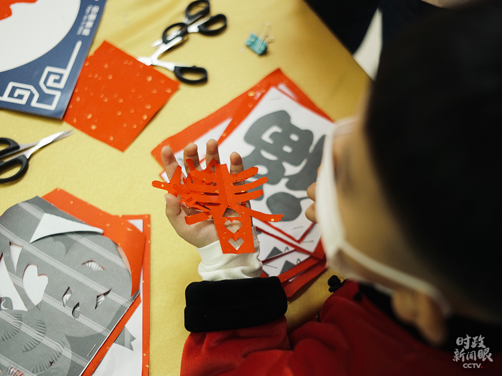 △孩子們在社區(qū)活動室練習剪紙。(總臺央視記者王哈男拍攝)