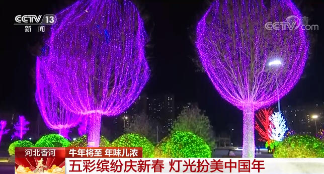 在河北廊坊市香河縣,城區(qū)亮化景觀和節(jié)日彩燈全部點亮。新城公園、五一公園等重要節(jié)點的亮化光源裝飾一新,街道兩側(cè)的行道樹上纏繞著五彩繽紛的線燈,營造出錯落有序、層次鮮明的亮麗夜景。街道兩側(cè)一串串火紅的燈籠,烘托出濃濃的年味。