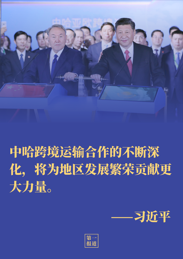 2017年6月8日,習近平主席在訪問哈薩克斯坦期間出席中哈亞歐跨境運輸視頻連線儀式,現場先后連線中哈連云港物流合作基地和“霍爾果斯-東大門”經濟特區無水港。