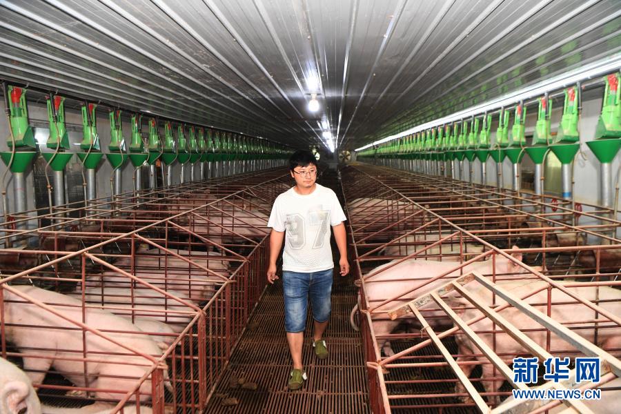 在重慶市萬州區高梁鎮天鵝村生豬生態養殖基地,工作人員在查看生豬生長情況(2020年6月5日攝)。新華社記者 王全超 攝