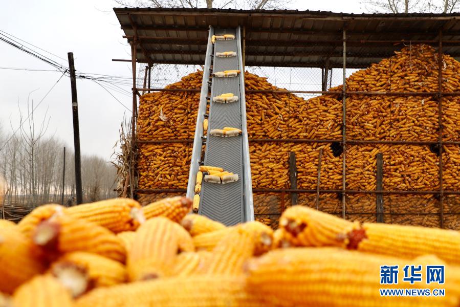 在哈爾濱市巴彥港鎮五星村農民程顯義家院內,玉米通過傳送帶進入玉米架子(2020年11月3日攝)。新華社記者 徐凱鑫 攝