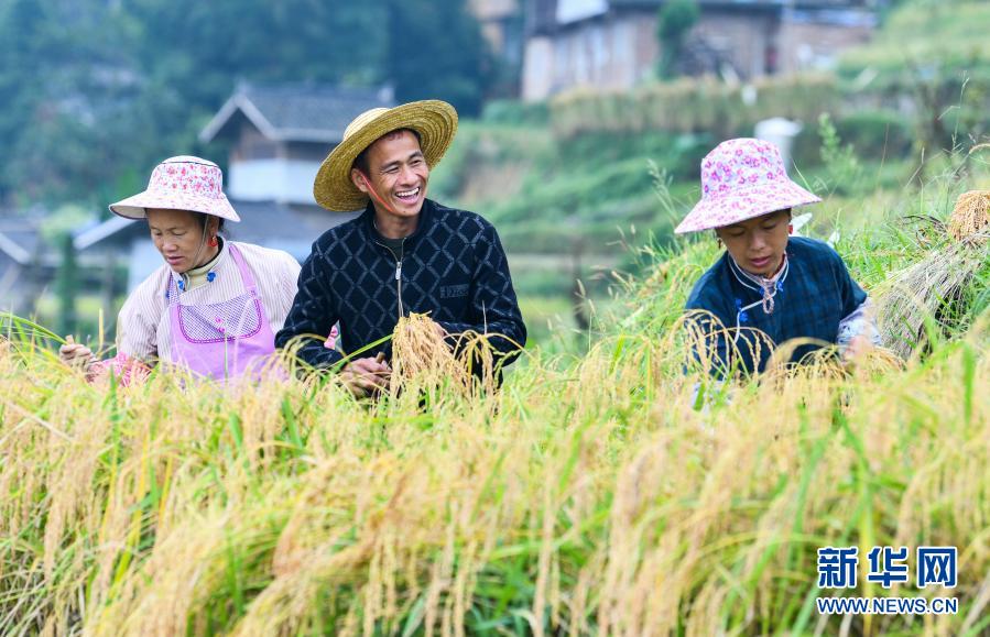 貴州省從江縣加榜鄉加車村的農民在收割水稻(2020年9月19日攝)。新華社記者 楊文斌 攝