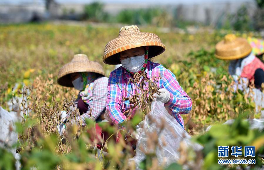 工人在采收中國農業科學院油料作物研究所在三亞繁育的大豆(2020年2月27日)。新華社記者 郭程 攝