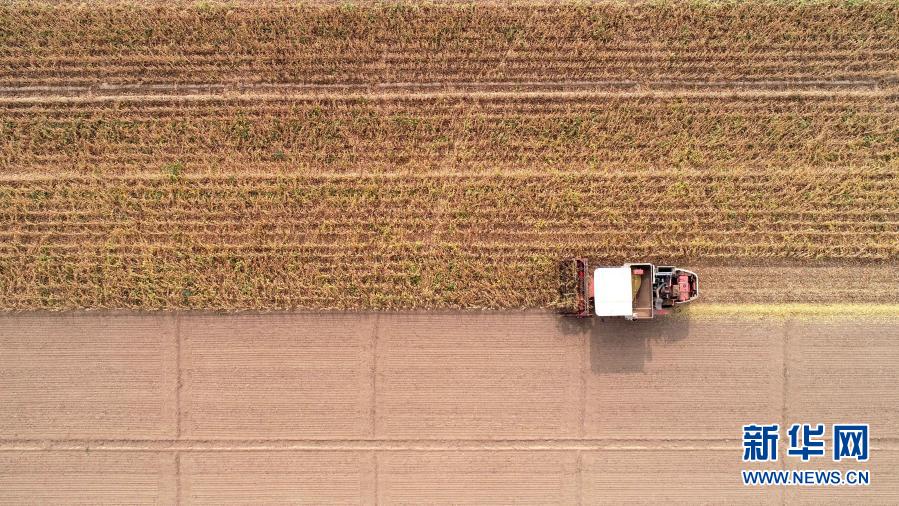 在河北省石家莊市藁城區梅花鎮朱家莊村的大豆田地里,農戶駕駛農機收割大豆(2020年10月10日攝,無人機照片)。新華社發(梁子棟 攝)