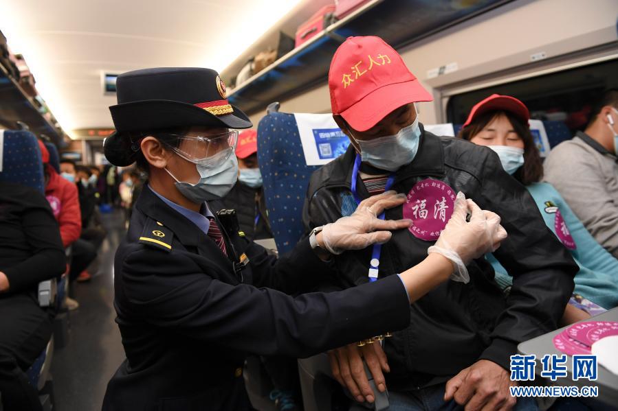 2月21日,在蘭州西開往福州的G1901次列車上,乘務(wù)員為務(wù)工人員貼上接站標(biāo)識(shí)牌。