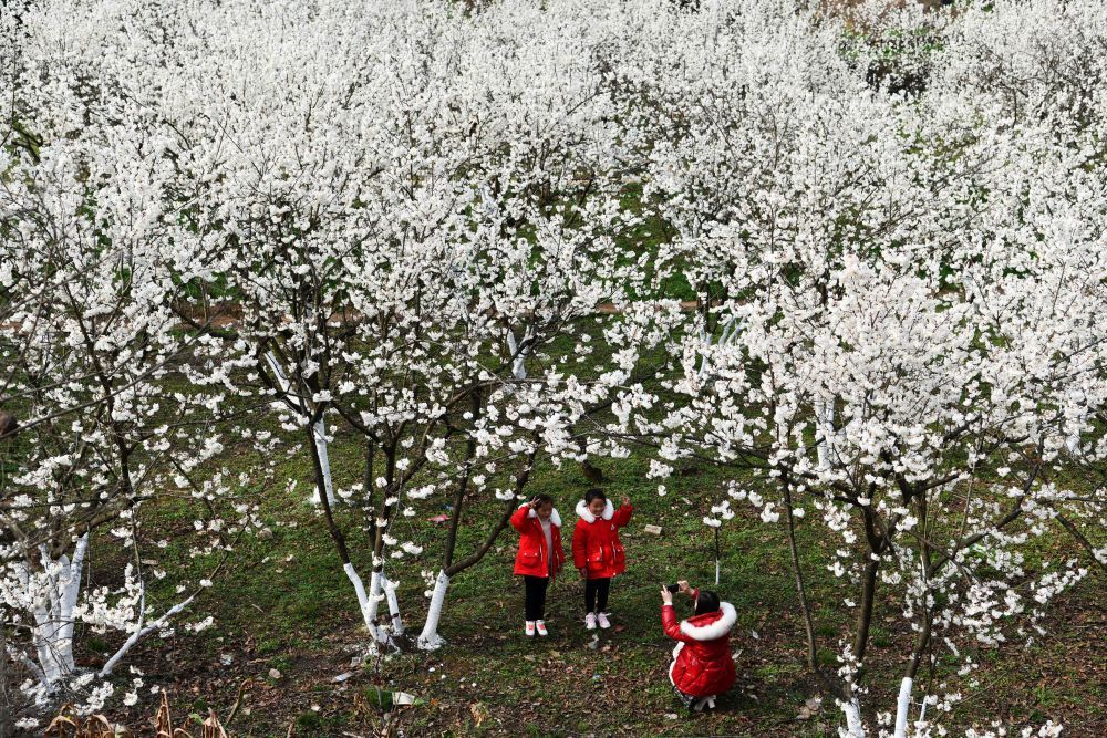 游客在貴州省黔西縣新仁苗族鄉化屋村的櫻桃樹下留影(2月19日攝)。新華社記者 楊文斌 攝