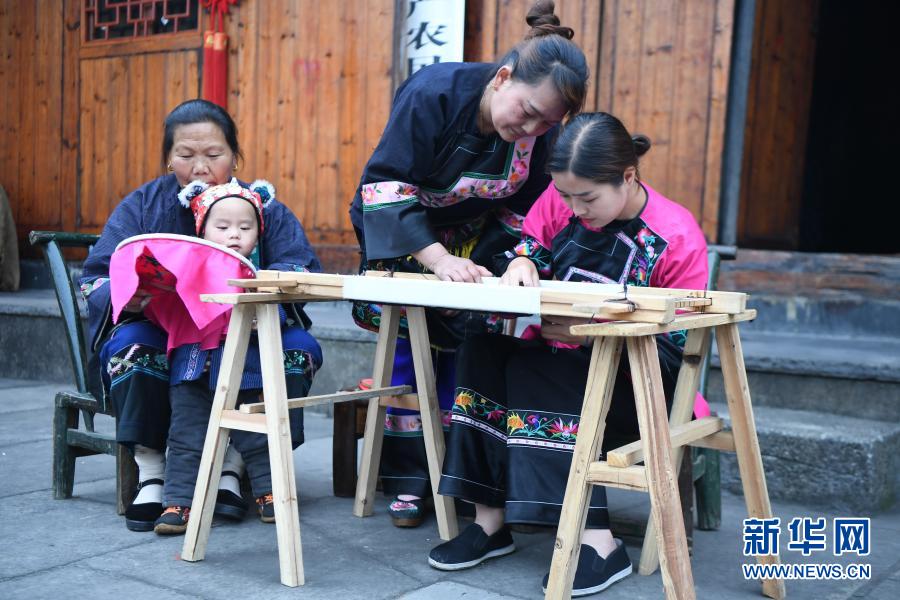 施林嬌(右一)在十八洞村學習苗繡(2020年4月25日攝)。新華社記者 薛宇舸 攝
