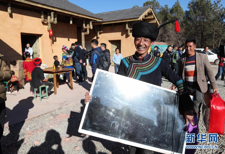 在四川省昭覺縣三河村的易地扶貧安置點,彝族群眾馬海日聰喜搬新居(2019年2月11日攝)。2019年2月11日,位于大涼山腹地的四川省昭覺縣三河村首批29戶、168人告別居住多年的土坯房,搬入易地扶貧安置點的新家。新華社記者 江宏景 攝