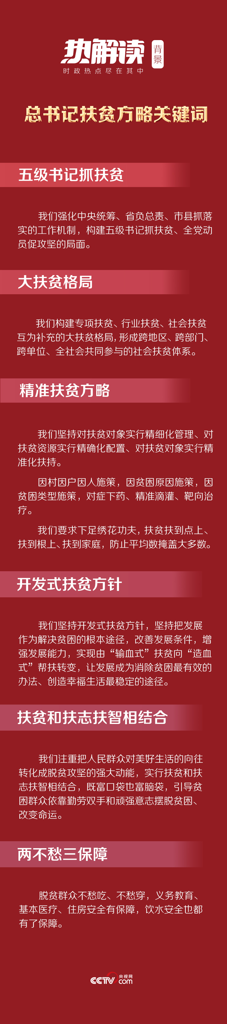 “我們立足我國國情,把握減貧規律,出臺一系列超常規政策舉措,構建了一整套行之有效的政策體系、工作體系、制度體系,走出了一條中國特色減貧道路,形成了中國特色反貧困理論。”