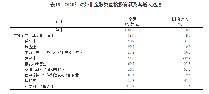 2020年對外非金融類直接投資額7598億元,比上年下降0.4%,折1102億美元,下降0.4%。其中,對“一帶一路”沿線國家非金融類直接投資額178億美元,增長18.3%。