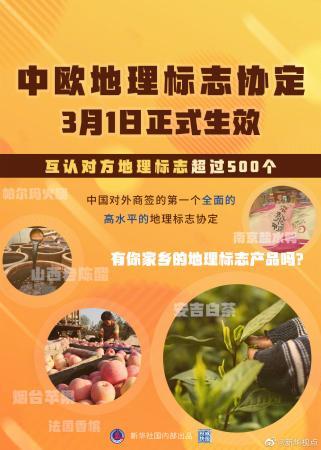 新華社北京3月1日電(記者 于佳欣)中歐地理標志協定今起生效。首批“上榜”的中歐各100個地理標志即日起受到保護,這意味著中國和歐盟的更多特色優質名品將進入彼此市場,不僅將更好保護中歐企業權益,也會讓雙方消費者買得放心。