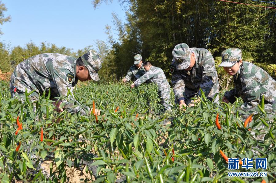 廣西梧州市長洲區人武部組織干部職工到對口幫扶的村子幫助村集體采摘辣椒(2020年12月3日攝)。新華社發(劉靜 攝)
