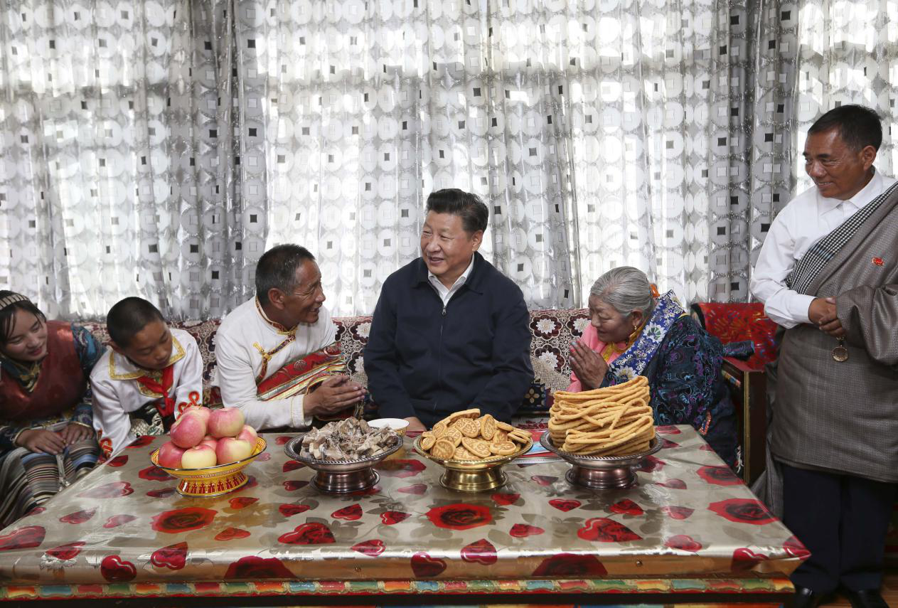 2016年8月22日,習近平總書記在青海省海西蒙古族藏族自治州格爾木市唐古拉山鎮長江源村藏族村民申格家中同一家人親切交談。
