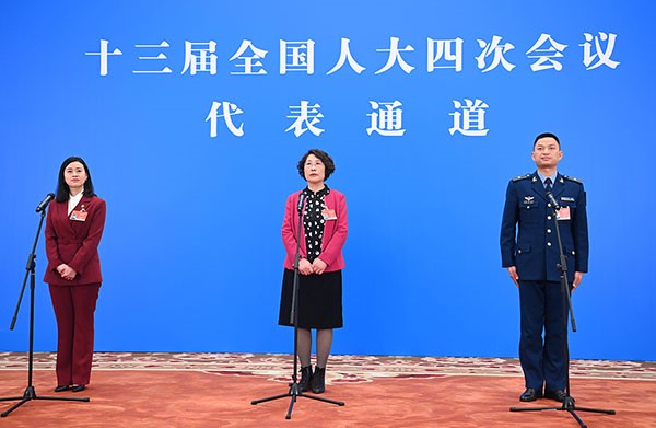 全國人大代表袁晶、郭艷玲、余海龍(從左至右)通過網(wǎng)絡(luò)視頻方式接受采訪。新華社記者 金良快 攝