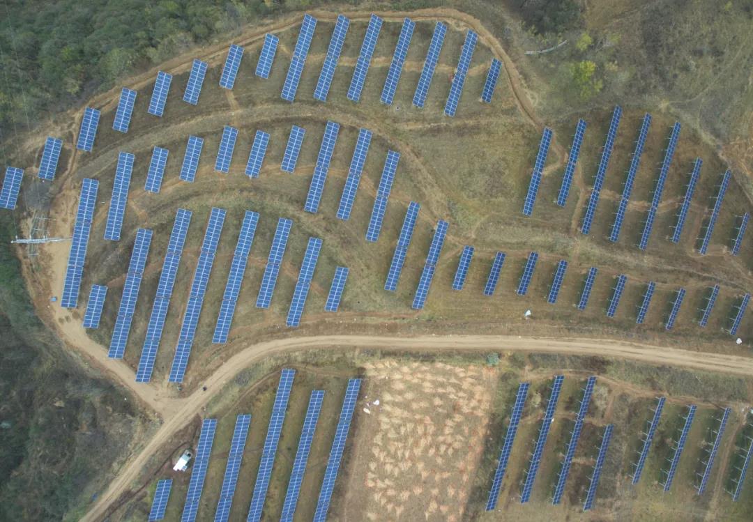 ▲陜西延安,航拍安塞區化子坪鎮楊園村光伏扶貧電站一角。