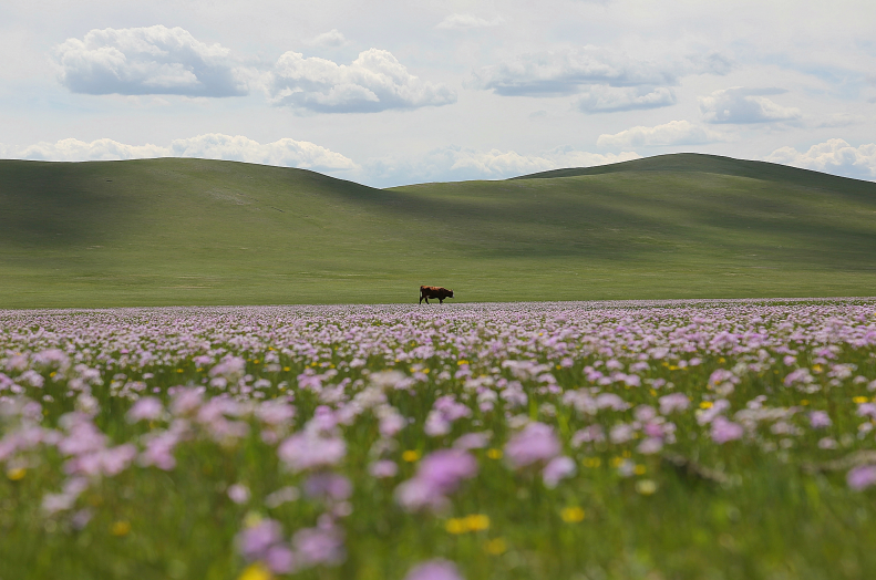 △這是在扎魯特旗拍攝的草原花海(2020年6月5日攝)。進入夏季,內蒙古自治區通遼市扎魯特旗北部山地草原生機勃勃。