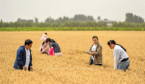 河北省邯鄲市臨漳縣狄邱鄉西狄邱村,農業技術人員在麥田內進行小麥測產。新華社記者 王曉攝