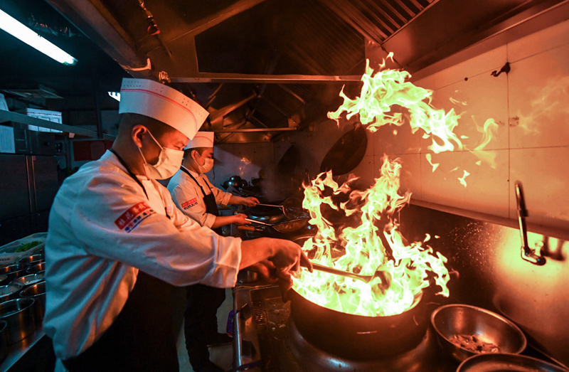 2月1日,在石家莊市橋西區(qū)一家餐廳,廚師在后廚佩戴口罩炒菜。新華社記者 王曉 攝