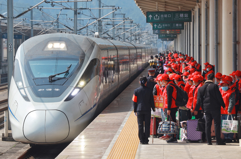 2月20日,務(wù)工人員在三穗站準備登上動車。當日,500余名貴州省黔東南苗族侗族自治州錦屏縣務(wù)工人員在三穗站搭乘2021年貴州首趟務(wù)工專列G2336次列車前往浙江義烏。新華社記者 劉續(xù) 攝