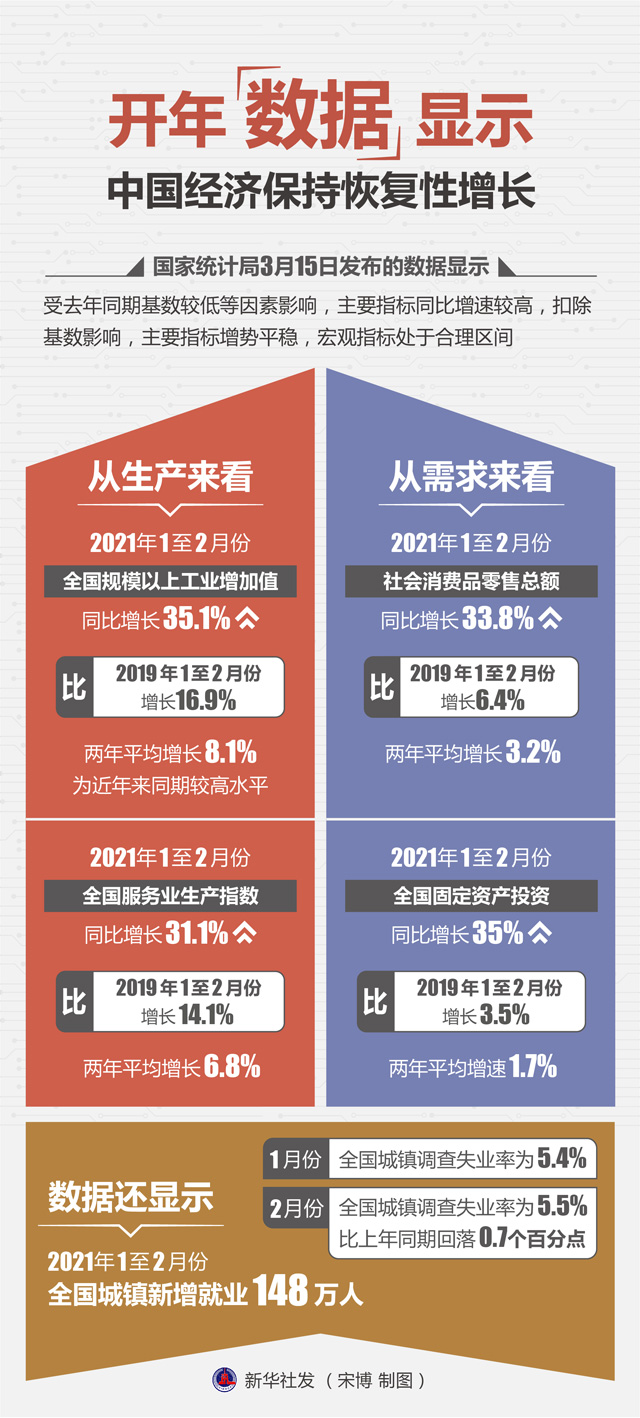 圖表:開年數(shù)據(jù)顯示中國經(jīng)濟保持恢復(fù)性增長 新華社發(fā) 宋博 制圖