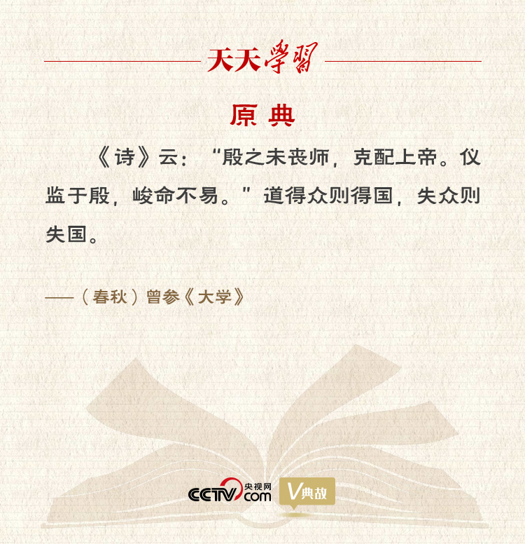 《大學》多次引用并闡釋《詩經》中的詩句。原典中的“殷之未喪師,克配上帝。儀監于殷,峻命不易”出自《詩經·大雅·文王》。喪師:失去民眾;儀:當作“宜”;峻命:大命,即天命。這句話意思是說,商沒有失去民心的時候,還能與天意相稱。我們應該以殷商為戒鑒,天命才不會變更。進而得出如下結論:“道得眾則得國,失眾則失國!钡溃褐钢螄牡览。意謂得到民眾的擁戴就能得到整個國家,失去民眾的擁護就會失去整個國家。這句話與孟子的“得道者多助,失道者寡助”一樣,都闡述了民心向背關乎國家興亡的道理。