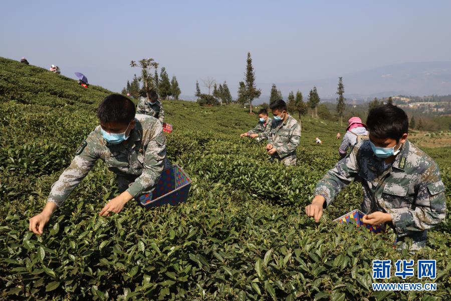 貴州省六盤水市水城區人武部組織基干民兵和群眾一起采摘新茶(2020年2月25日攝)。新華社發(趙嬋娟 攝)