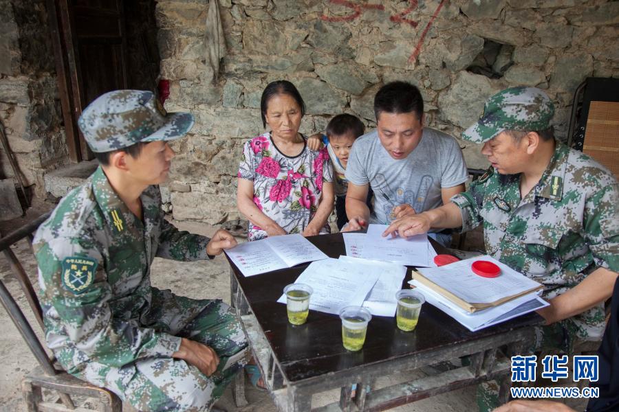 湖北省恩施軍分區“131”扶貧小分隊到對口幫扶的紅土鄉天落水村村民家中入戶核實相關情況(2018年7月4日攝)。新華社發(王海 攝)