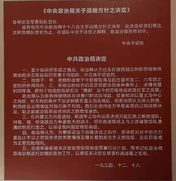 會議從白天開到深夜,爭論十分激烈。最終,與會多數同志接受了毛澤東同志“向黔西北進軍”的正確主張,通過了根據他的發言寫成的《中央政治局關于戰略方針之決定》。