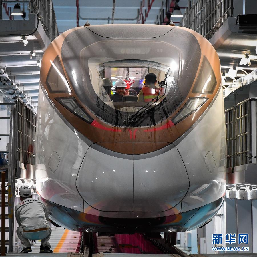參加熱滑試驗(yàn)的技術(shù)人員對廣州地鐵18號線時(shí)速160公里電客車進(jìn)行發(fā)車前最后一次設(shè)備狀況查驗(yàn)(3月3日攝)。新華社記者 劉大偉 攝