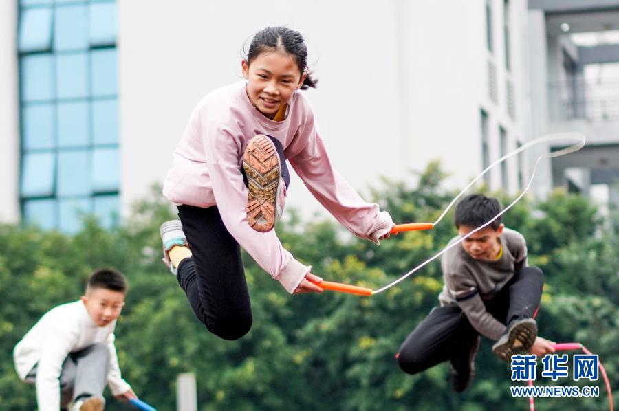 2020年12月9日,重慶市九龍坡區(qū)西彭鎮(zhèn)第一小學(xué)校跳繩隊(duì)隊(duì)員在進(jìn)行花樣跳繩訓(xùn)練。該校從1999年開始引進(jìn)跳繩,開展特色體育活動。新華社記者 劉潺 攝