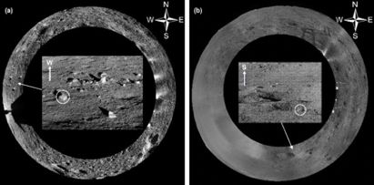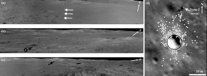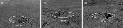已有研究結果顯示,位于著陸區西北方向的織女撞擊坑的一條濺射紋恰好穿過了著陸點附近區域,而濺射紋內常?梢娪蔀R射物形成的二次撞擊坑!坝裢枚枴毖惨晠^確實還能觀察到若干個內部和周邊均存在碎塊狀物質的米級和亞米級的新鮮撞擊坑(如下圖所示)。結合橢圓撞擊坑的長軸方向推斷,這些新鮮撞擊坑應當為織女撞擊坑濺射物形成的二次撞擊坑。