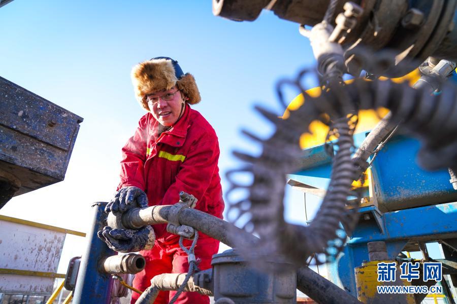 大慶油田1205鉆井隊鉆井工人在野外鉆井平臺作業(1月7日攝)。新華社記者 王松 攝