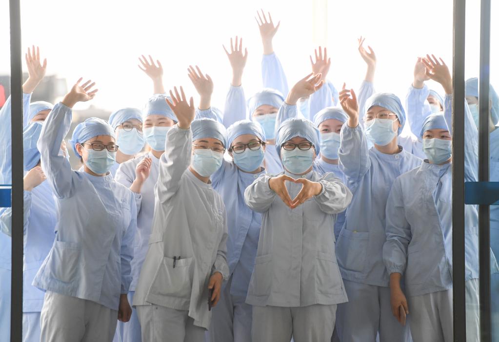 2020年3月23日,在武漢天河機場,湖北省武漢市第一醫院醫護人員為廣東第14批援鄂醫療隊送行。新華社記者 陳曄華 攝