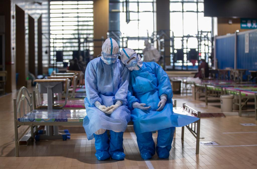 2020年3月10日,在湖北省武漢市武昌方艙醫院,青海醫療隊隊員劉海婷(左)、許國娟在等待新冠肺炎治愈患者出艙時小憩。當日,武昌方艙醫院最后一批新冠肺炎治愈患者出艙。新華社記者 費茂華 攝