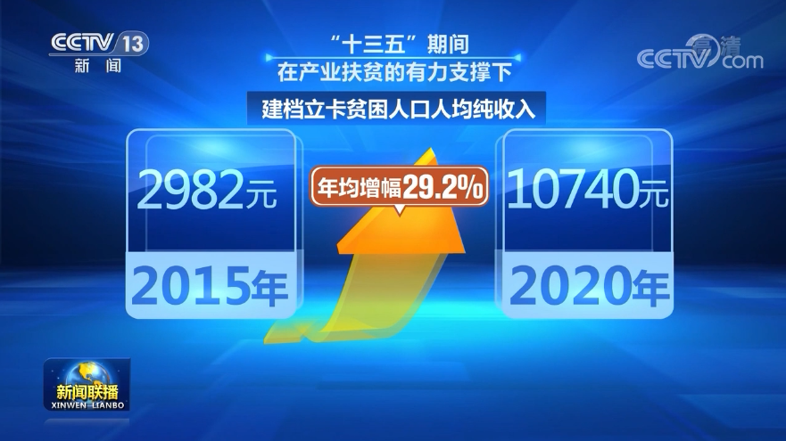 “十三五”期間,在產業扶貧的有力支撐下,建檔立卡貧困人口人均純收入由2015年的2982元,增加到2020年的10740元,年均增幅29.2%。