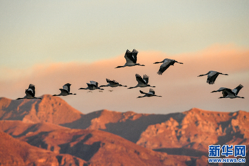 黑頸鶴在拉薩市林周縣黑頸鶴自然保護區上空飛翔(2019年1月1日攝)。新華社記者 張汝鋒 攝