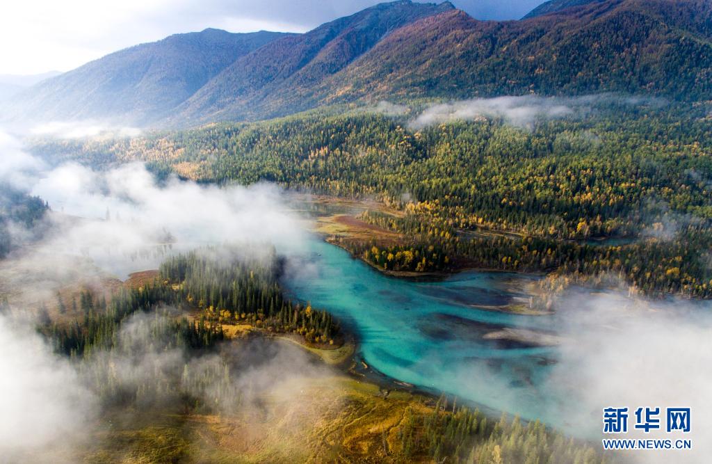 金秋時節(jié),新疆阿勒泰地區(qū)喀納斯景區(qū)內(nèi)的林木與喀納斯湖相互映襯,美不勝收(2019年9月24日攝,無人機照片)。