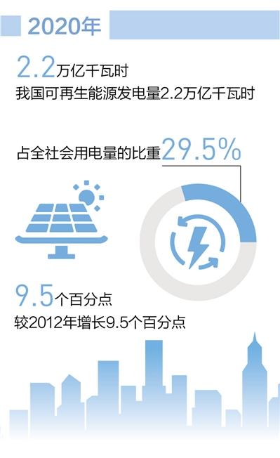 數(shù)據(jù)顯示,截至2020年底,我國(guó)水電裝機(jī)3.7億千瓦、風(fēng)電裝機(jī)2.8億千瓦、光伏發(fā)電裝機(jī)2.5億千瓦、生物質(zhì)發(fā)電裝機(jī)2952萬(wàn)千瓦,分別連續(xù)16年、11年、6年和3年穩(wěn)居全球首位。如果拿三峽電站2250萬(wàn)千瓦的總裝機(jī)容量來(lái)比較,9.3億千瓦的可再生能源發(fā)電裝機(jī)差不多相當(dāng)于41個(gè)三峽電站。