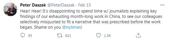 美國專家彼得·達薩克博士在社交媒體上駁斥《紐約時報》的報道。圖為截屏