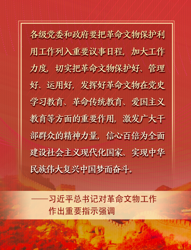 近日,習(xí)近平總書(shū)記對(duì)革命文物工作作出重要指示,深刻闡明革命文物工作的重大意義、目標(biāo)任務(wù)和基本要求,為做好新時(shí)代革命文物工作提供了根本遵循。