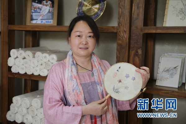 “花茂人家”文化工坊負(fù)責(zé)人張勝迪向游客展示扇子。新華網(wǎng) 蔡連素 攝