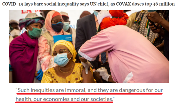 聯(lián)合國秘書長古特雷斯近日發(fā)表視頻致辭再次強調(diào),新冠疫情危機凸顯出全球范圍內(nèi)的不平等。中低收入國家無法公平獲得疫苗違背道德,“正將我們的健康、經(jīng)濟和社會推向險境”。