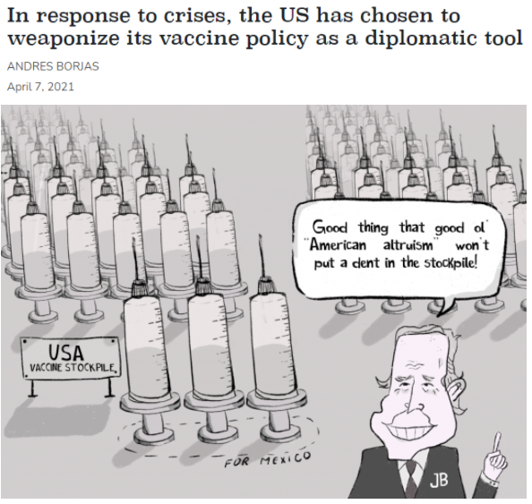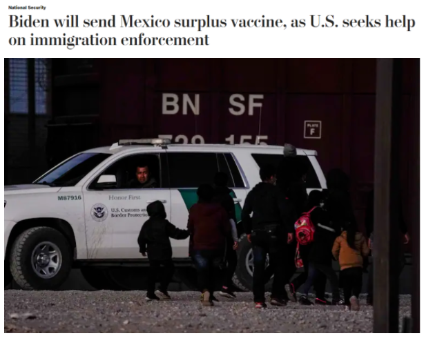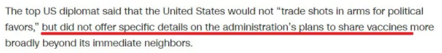 除了分享疫苗的時間和對象不明,布林肯的每句話幾乎都讓人聽出了打自己臉的意思。比如,布林肯稱美國“不會用疫苗換取政治利益”?蓪嶋H上,美國同意“借給”墨西哥疫苗的條件就是后者必須管好美墨邊境上的非法移民潮。