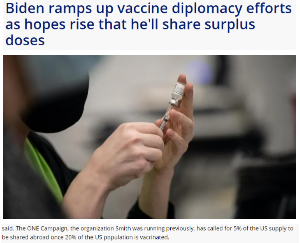 就在上個月,國際非營利組織“ONE Campaign”稱,美國政府已經(jīng)購買了4.53億劑的超量疫苗,而到目前為止,美國只向加拿大和墨西哥“借出”400萬劑疫苗。為此,該組織敦促美國總統(tǒng)拜登在20%的美國人完全接種疫苗后,將其5%的儲備劑量分享給其他國家。