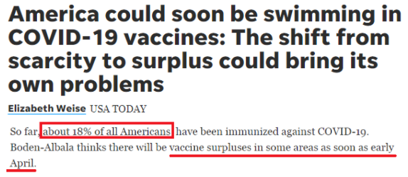 截至目前,美國已有超過6200萬人完全接種了疫苗,約占總?cè)丝诘?8%。有專家認為,美國一些地區(qū)最早在4月初就會出現(xiàn)疫苗過剩的情況。
