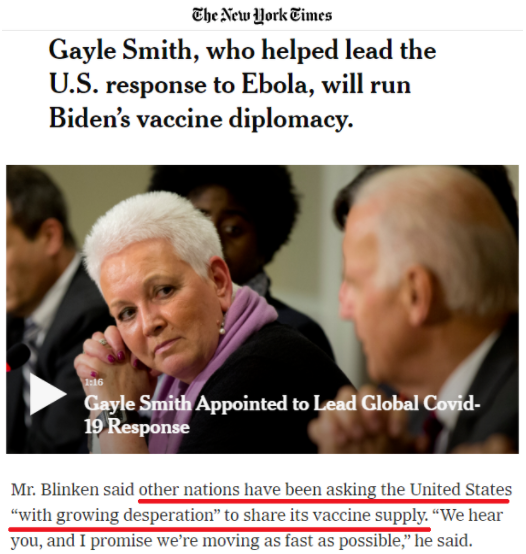 或許是在這樣一個時刻突然“良心發(fā)現(xiàn)”,一直攻擊他國搞“疫苗外交”的美國居然自己也要搞了:當?shù)貢r間5日,美國國務(wù)院任命公共衛(wèi)生專家蓋爾·史密斯為“全球新冠疫情應(yīng)對及衛(wèi)生安全協(xié)調(diào)員”,就新冠疫苗展開外交工作。